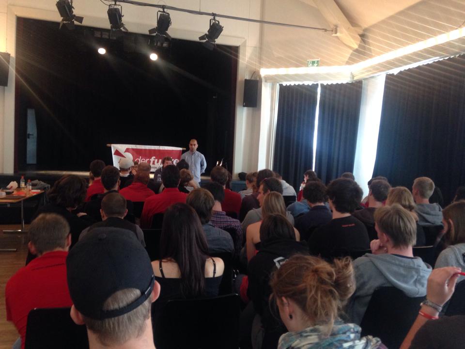 Samedi matin, Hamid Alizadeh de Londres, coéditeur de www.marxist.com et éditeur d’une revue révolutionnaire d’iraniens exilés, tenait une présentation sur la situation mondiale actuelle. Dans un survol large, il nous parla de la situation au Moyen Orient, de la crise en Ukraine et de l’évolution de la crise du capitalisme en Europe, en Asie ou encore aux États-Unis. Il insistait sur la nécessité de construire un parti révolutionnaire qui, armé avec un programme socialiste, sera capable de montrer une issue à la crise aux mouvements de masse dans le monde entier. Une telle issue est uniquement possible en reversant le système capitaliste. Ensuite durant l’après-midi se tenaient des ateliers sur la première guerre mondiale, l’histoire économique ou les mouvements d’apprentis. Le rôle de la social-démocratie durant la première guerre mondiale, les tendances de crise du capitalisme et les perspectives pour l’organisation des apprentis aujourd’hui furent traités dans les discussions fort engagées qui suivaient les présentations. Il y avait également de sujets fort intéressants le dimanche, entre autre la question des rapports de genre, la situation au Moyen-Orient, la crise en Europe, la philosophie marxiste ou encore les mouvements révolutionnaires de mai 1968 en France.