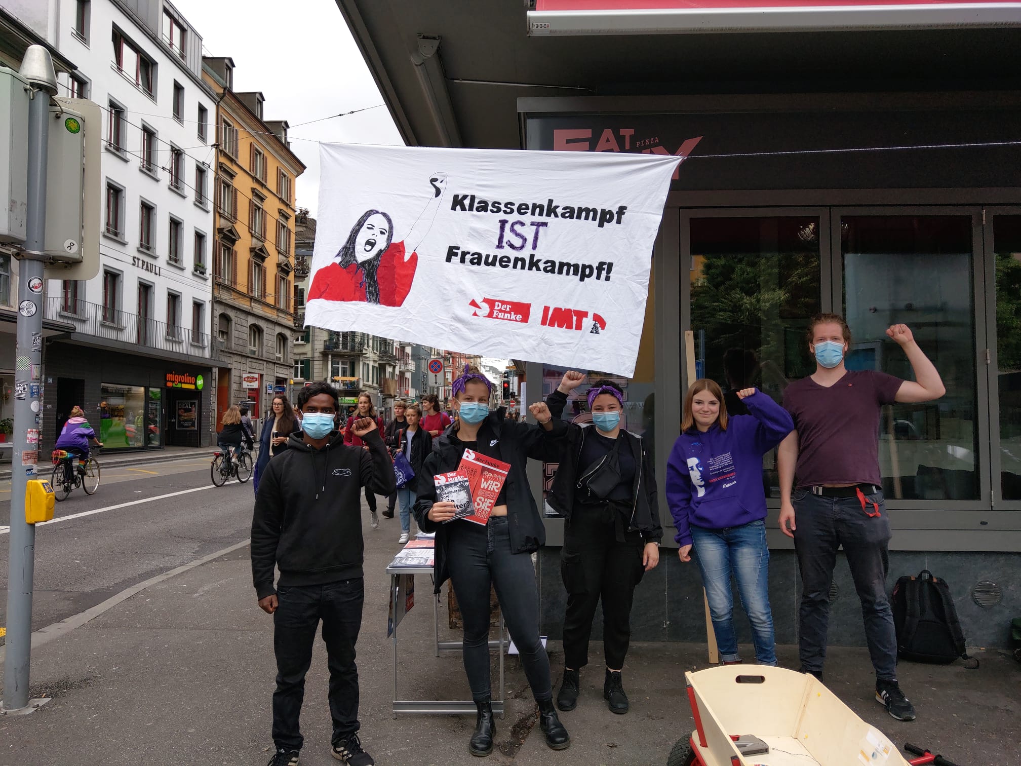 Nous avons mené des discussions très intéressantes et les jeunes femmes, pour la plupart, étaient très ouvertes aux idées révolutionnaires. Notre brochure »Frauenstreik 2019 – Wie weiter? » et la dernière édition de notre journal étaient très convoités. En général, un état d’esprit militant était clairement perceptible, les événements des derniers mois ont laissé des traces dans la population et pour beaucoup de gens, il devient de plus en plus évident que nos demandes d’émancipation et d’égalité des femmes ne sont possibles qu’en surmontant le capitalisme.