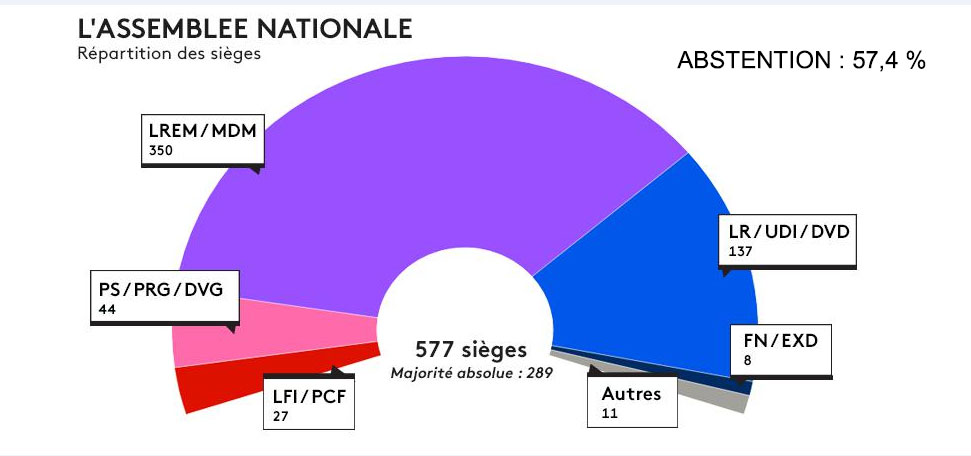 La composition de la nouvelle Assemblée nationale est plus que jamais déconnectée de la réalité politique du pays. Après avoir réuni 8,6 millions de voix au premier tour de la présidentielle, Macron pourra s’appuyer sur une majorité absolue de 350 députés de LREM/Modem. De son côté, Mélenchon avait réuni 7 millions de voix à la présidentielle, mais l’Assemblée nationale ne comptera que 27 députés la France insoumise (FI) et du PCF (ou 28 si, par bonheur, Valls est finalement battu).