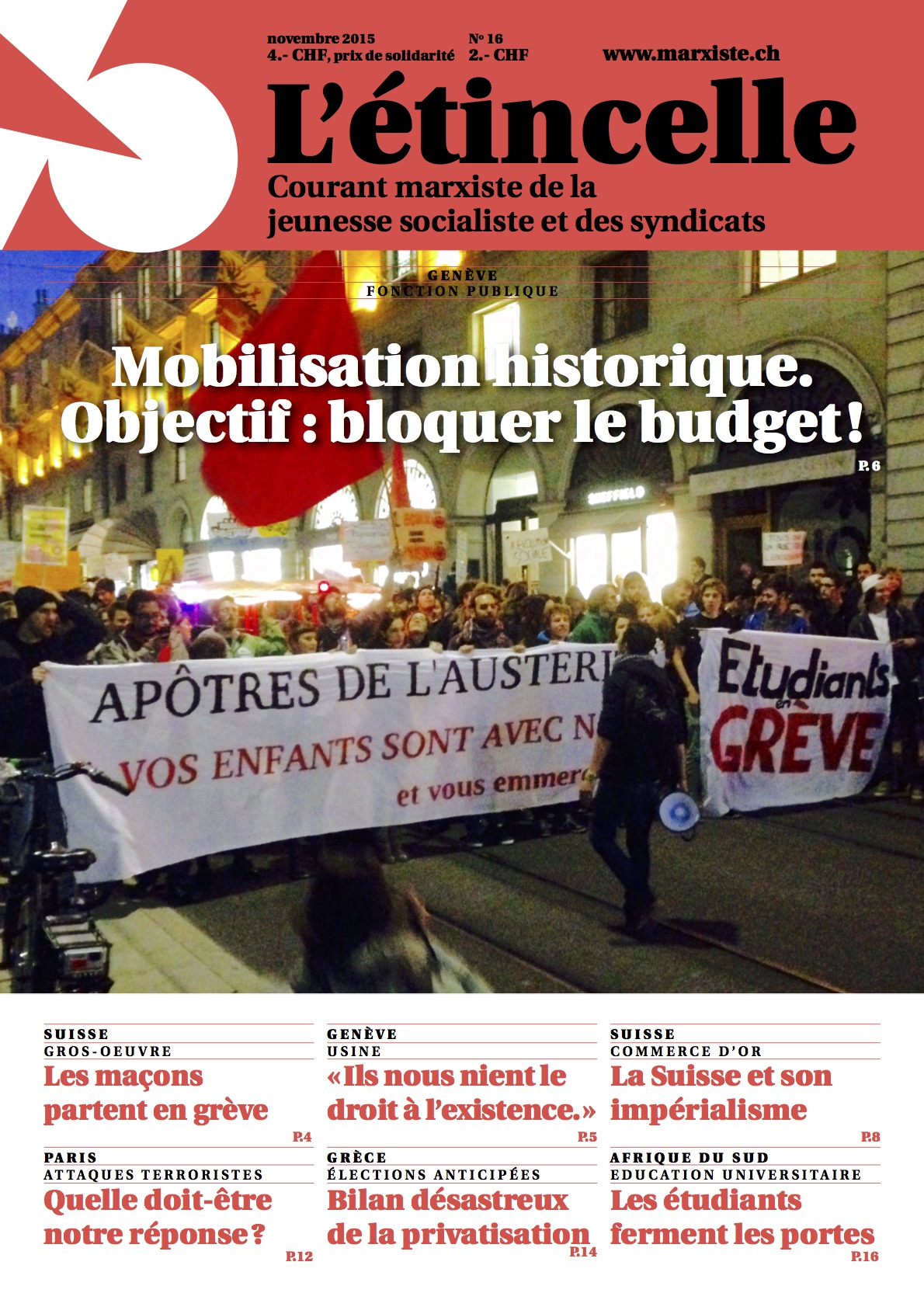 Il est impossible, malgré l’affirmation répétée des courants gauchistes, de « conscientiser » la population depuis l’extérieur. Pourtant, si des événements majeurs sont à l’ordre de jour, leur impact sur la conscience est immédiat. Même en gardant un sens des proportions très strict, nous pouvons affirmer que les mobilisations des 11, 12 et 13 novembre 2015 forment un premier jalon important dans la radicalisation de certaines couches de la population à Genève.