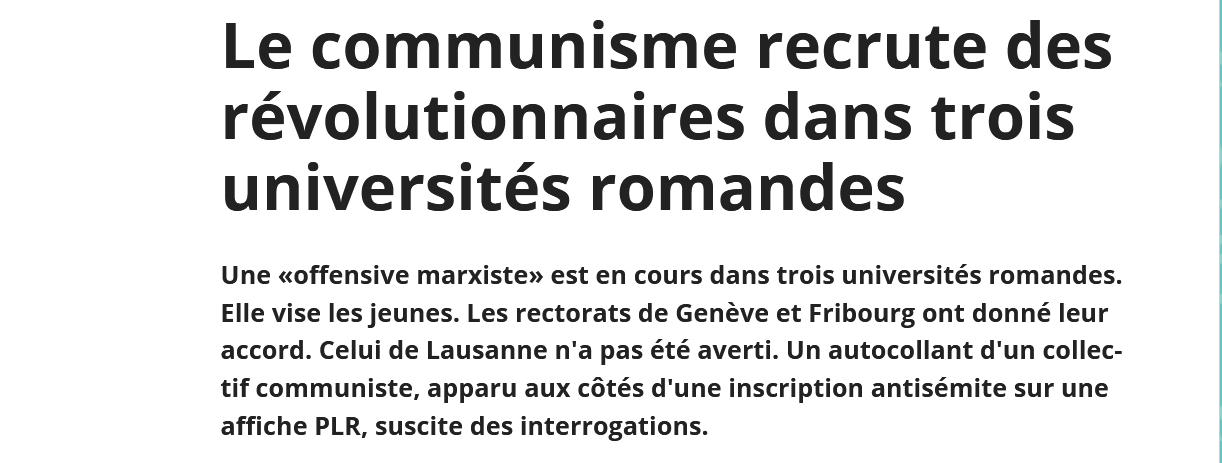 Depuis que nous avons lancé la campagne “es-tu communiste ?”, des centaines de jeunes en Romandie, mais aussi partout dans le monde, nous ont contacté pour rejoindre l’organisation révolutionnaire. Nos affiches ne passent pas non plus inaperçues des conservateurs, qui s’étranglent de voir le communisme revenir en force. Ils espéraient que celui-ci était définitivement enterré mais la crise profonde dans laquelle est la société actuelle le ramène à l’ordre du jour. Le communisme représente aujourd’hui un moyen de sortir de la barbarie du système actuel et libérer tout le potentiel de l’humanité. C’est pour cela que nous recrutons et c’est pour cela que la jeunesse répond massivement à notre campagne de recrutement. Dépassés par les événements, ces journalistes conservateurs n’ont plus qu’à répéter en boucle de vieux clichés, en nous offrant un peu de pub gratuite au passage, ce que fait le dernier exemple en date, un article paru sur watson.ch.