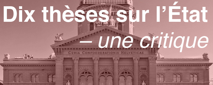 Nous saluons vivement le fait que le Comité directeur de la Jeunesse Socialiste suisse (ci-après : CD) se soit lancé dans le débat concernant la question de l’État que nous avons lancé et qu’il ait, avec ses dix thèses, écrit sa propre contribution. Cependant les « dix thèses sur l’État » ne sont à notre avis pas suffisantes considérant les exigences d’une analyse cohérente et atteignent pour cette raison des conclusions politiques contradictoires et fausses.