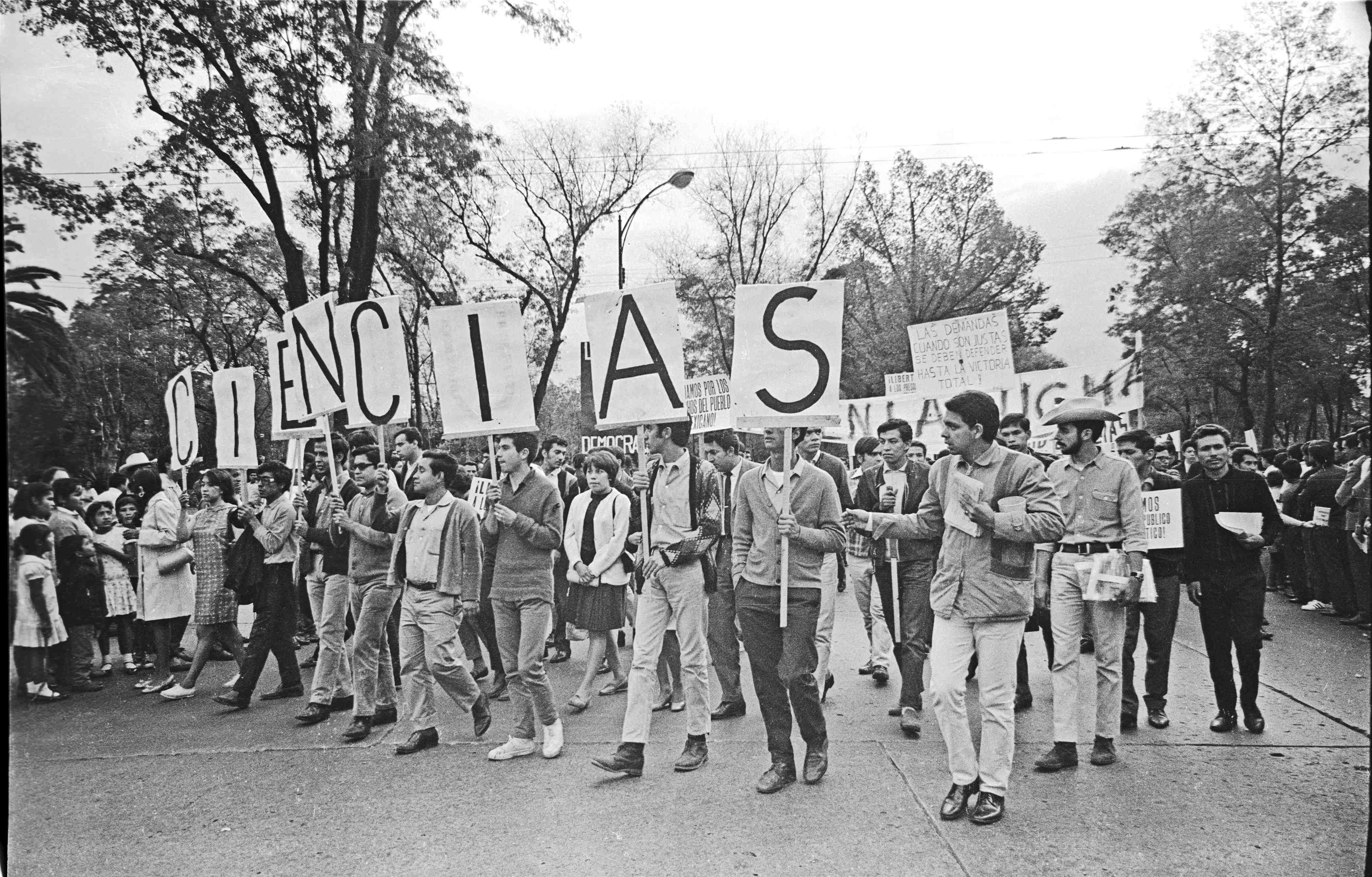 Au-delà de l’apparence de “progrès” que vivait le Mexique à la fin des années 60, la lutte étudiante a permis d’exprimer les profondes contradictions existantes dans la société et de raviver la contestation sociale. Inspirée par les mouvements de mai 68 en Europe, les luttes des droits civiques aux USA et surtout par l’exemple de Cuba et du Che, vers la fin du mois de juillet 1968 éclata une grève dans les principaux établissements universitaires mexicains. L’élément déclencheur fut, en réalité, assez banal et hasardeux. Deux manifestations simultanées, une convoquée par des étudiants proches du PRI et une autre convoquée par des étudiants communistes, se sont croisées le 26 juillet 1968. Elles ont été accueillis brutalement par la police. Suite à la répression, un sentiment d’indignation et de colère s’est imposé aux universités. L’intervention des forces policières dans les universités fut la goutte qui fit déborder le vase. Progressivement, les étudiants commencèrent à occuper les installations universitaires, principalement à l’UNAM mais le mouvement s’est rapidement étendu aux autres établissements. Dans un premier temps, ce développement s’est fait de manière très spontanée à partir de “Comités de lutte” qui étaient les noyaux démocratiques de base. Néanmoins, un pas qualitatif énorme a été fait avec la création, le 8 août, du Conseil National de Grève dont l’objectif était de coordonner les différents établissements en lutte et d’élaborer des objectifs plus ou moins clairs. Le conseil dirigeait une grève de plus de 250’000 grévistes, dont une écrasante majorité venait de la seule ville de Mexico. Toutefois, dans les rues la participation était plus importante avec au moins 300’000 personnes dans la manifestation du 27 août, ce qui était très significatif dans une société sclérosée. A défaut d’avoir des moyens médiatiques pour diffuser leurs idées, des brigades étaient mises en place afin d’aller dans les rues pour expliquer à la population les revendications des grévistes.