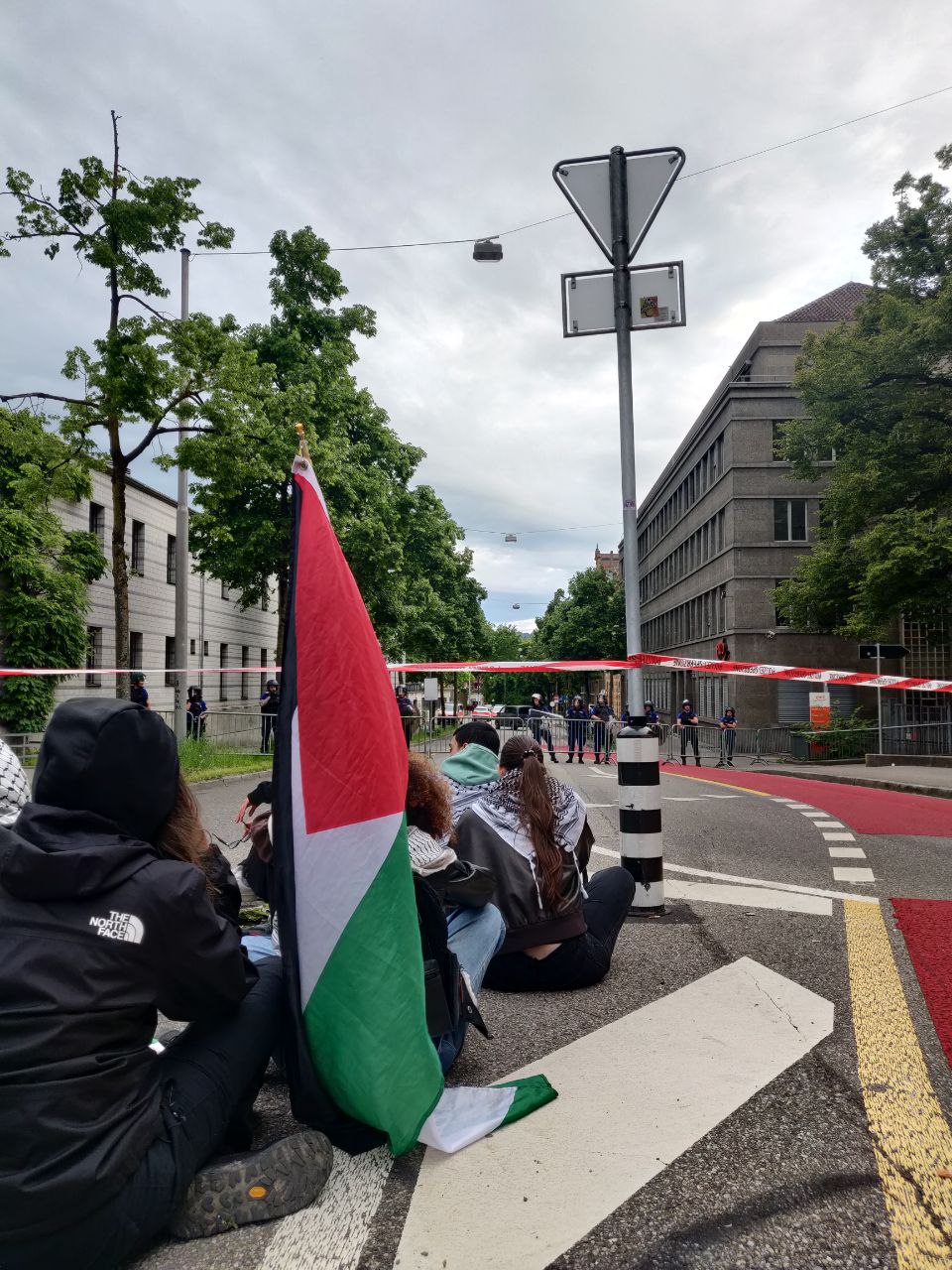 La manifestation s’est ensuite rendue du Palais fédéral à l’ambassade américaine. Un chauffeur de bus entre le Palais fédéral et l’ambassade a applaudi avec enthousiasme et crié des slogans. La police a bloqué le cortège devant l’ambassade. Certains, dans leur volonté de se battre, ont voulu bloquer la route en s’asseyant et sont restés assis face aux flics pendant un long moment.